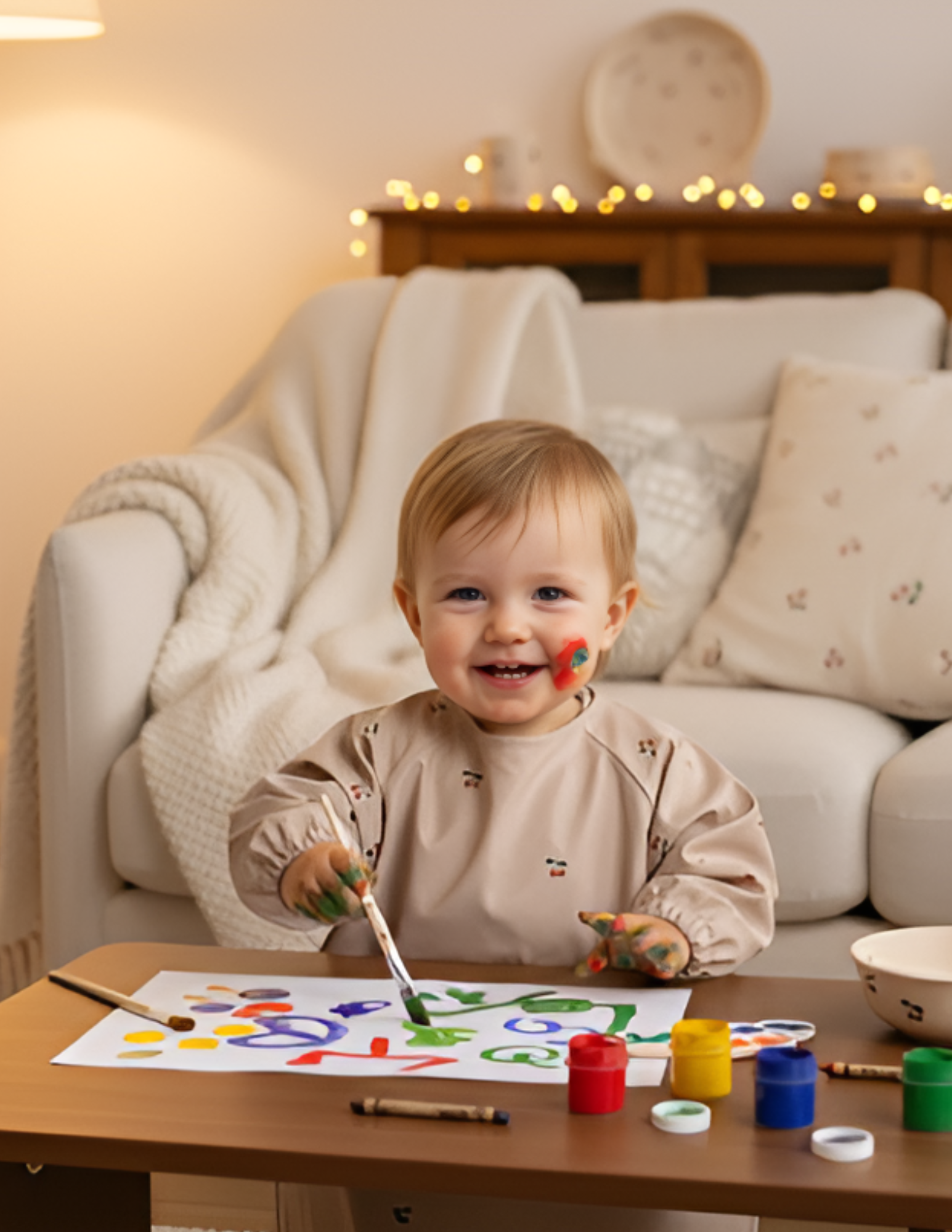 Disponible dans des motifs neutres qui s'harmonisent avec tout. Idéal pour les repas, les activités artistiques et les jeux sensoriels .