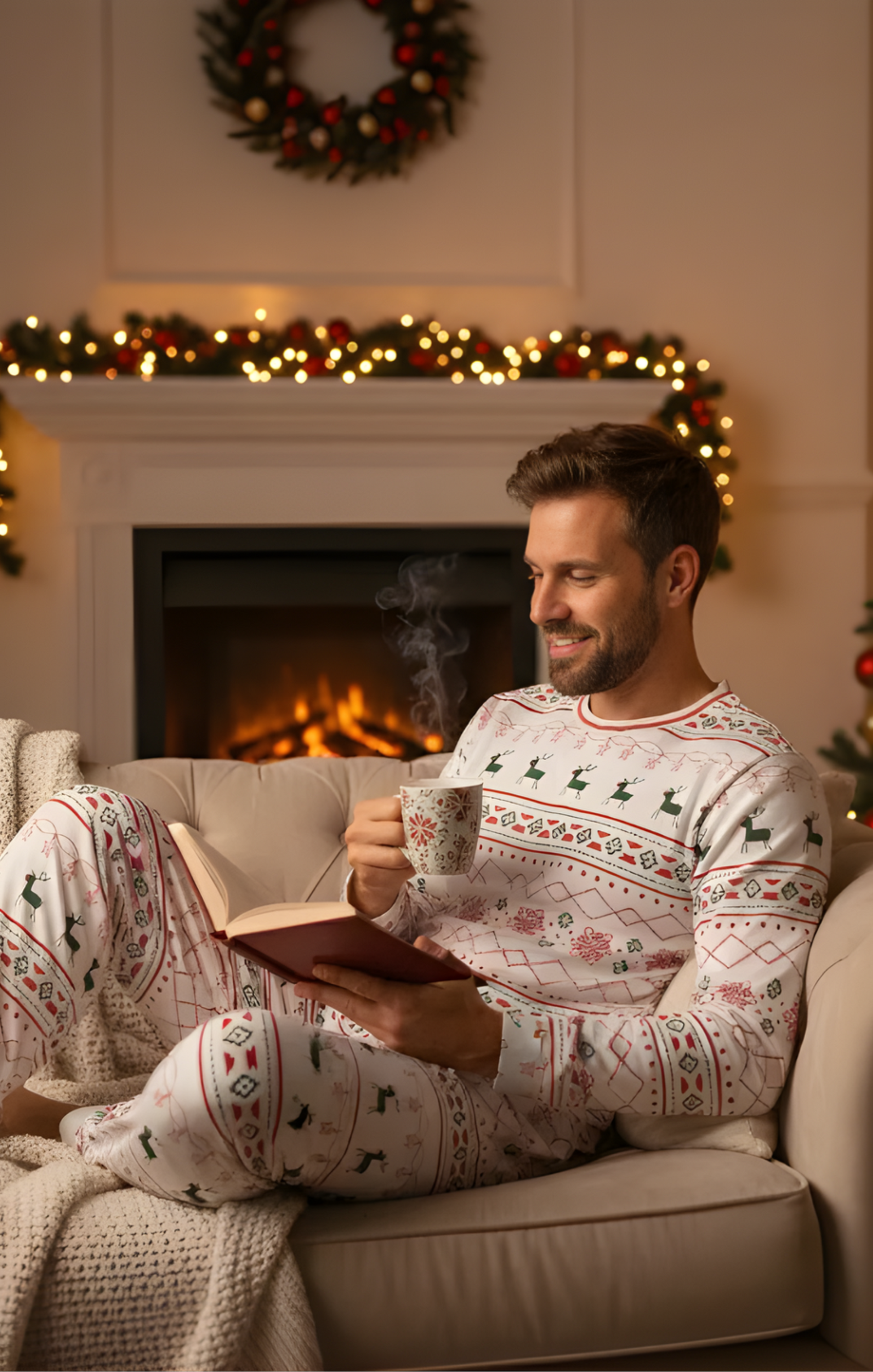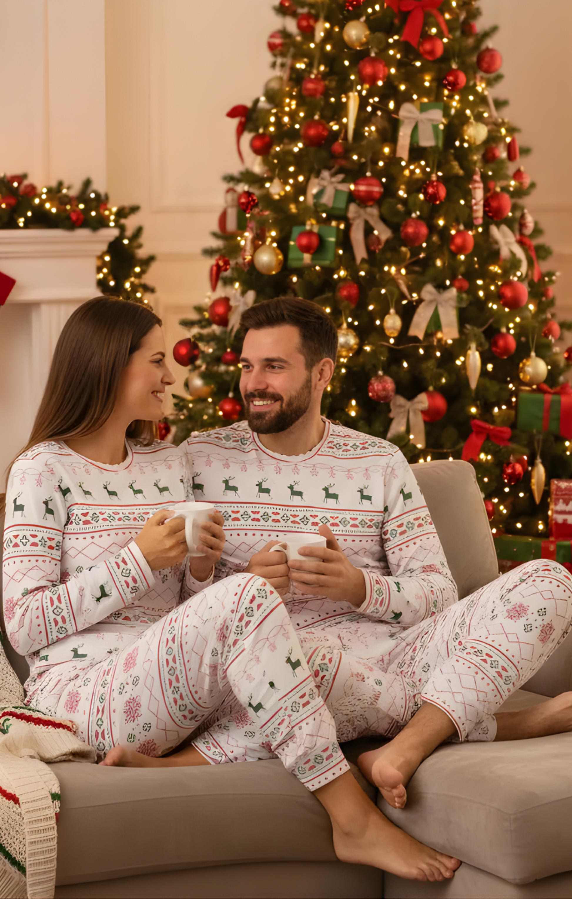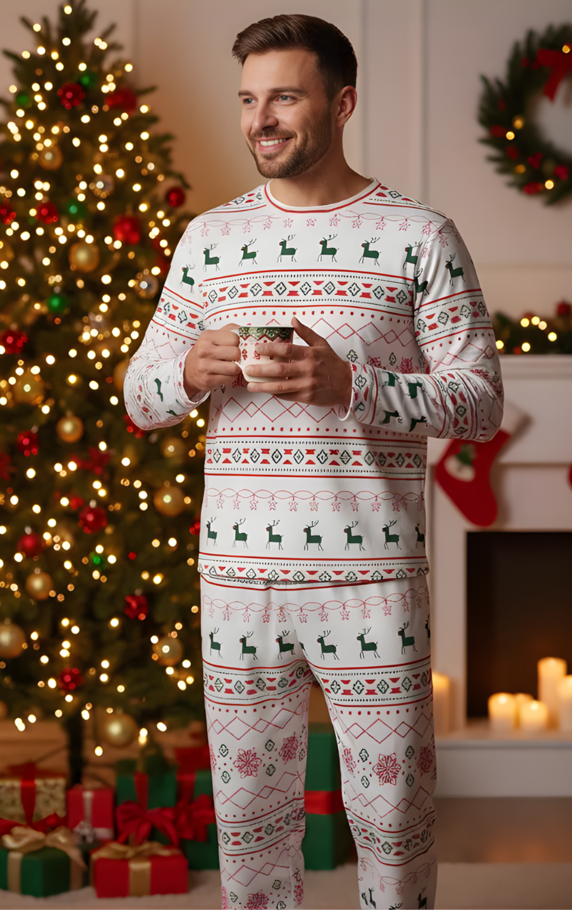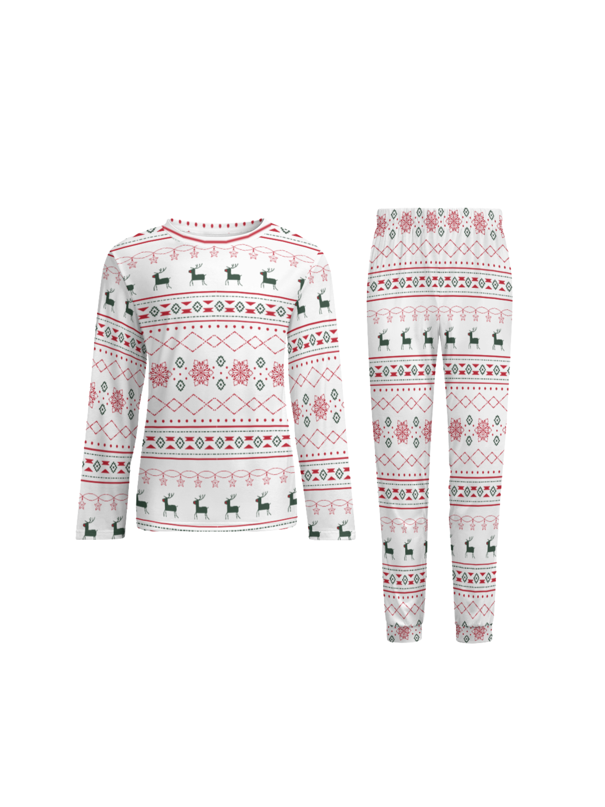 Fait de 95 % polyester et 5 % spandex, cet ensemble deux pièces comprend un haut à manches longues à col rond et un pantalon assorti à motifs de Noël signés Bloom. Léger, respirant et doux pour la peau, ce pyjama est idéal pour se coller au chaud ou profiter des matins festifs au pied du sapin.