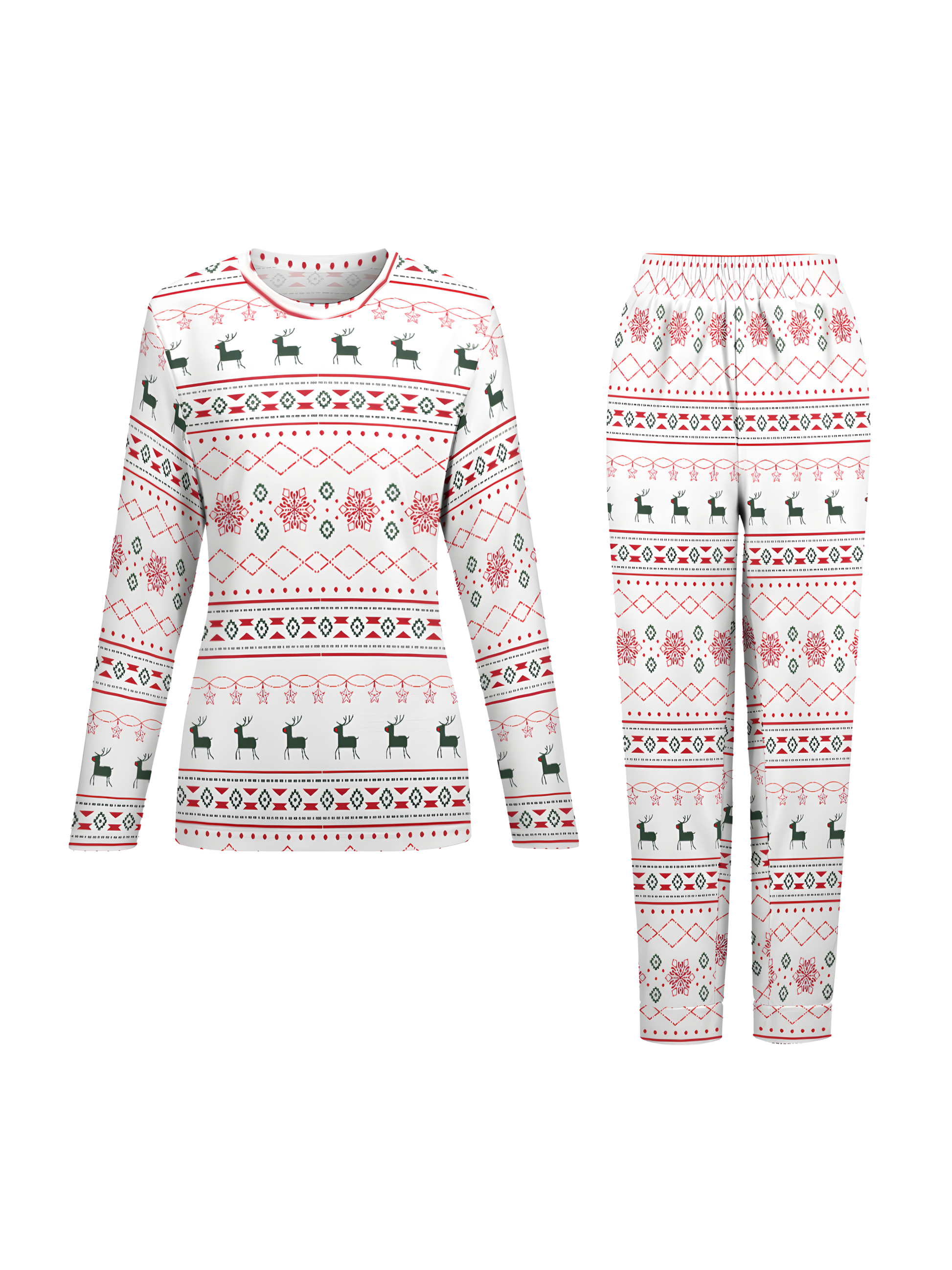 Fait de 95 % polyester et 5 % spandex, cet ensemble deux pièces comprend un haut à manches longues à col rond et un pantalon assorti à motifs de Noël signés Bloom. Léger, respirant et doux pour la peau, ce pyjama est idéal pour se coller au chaud ou profiter des matins festifs au pied du sapin.