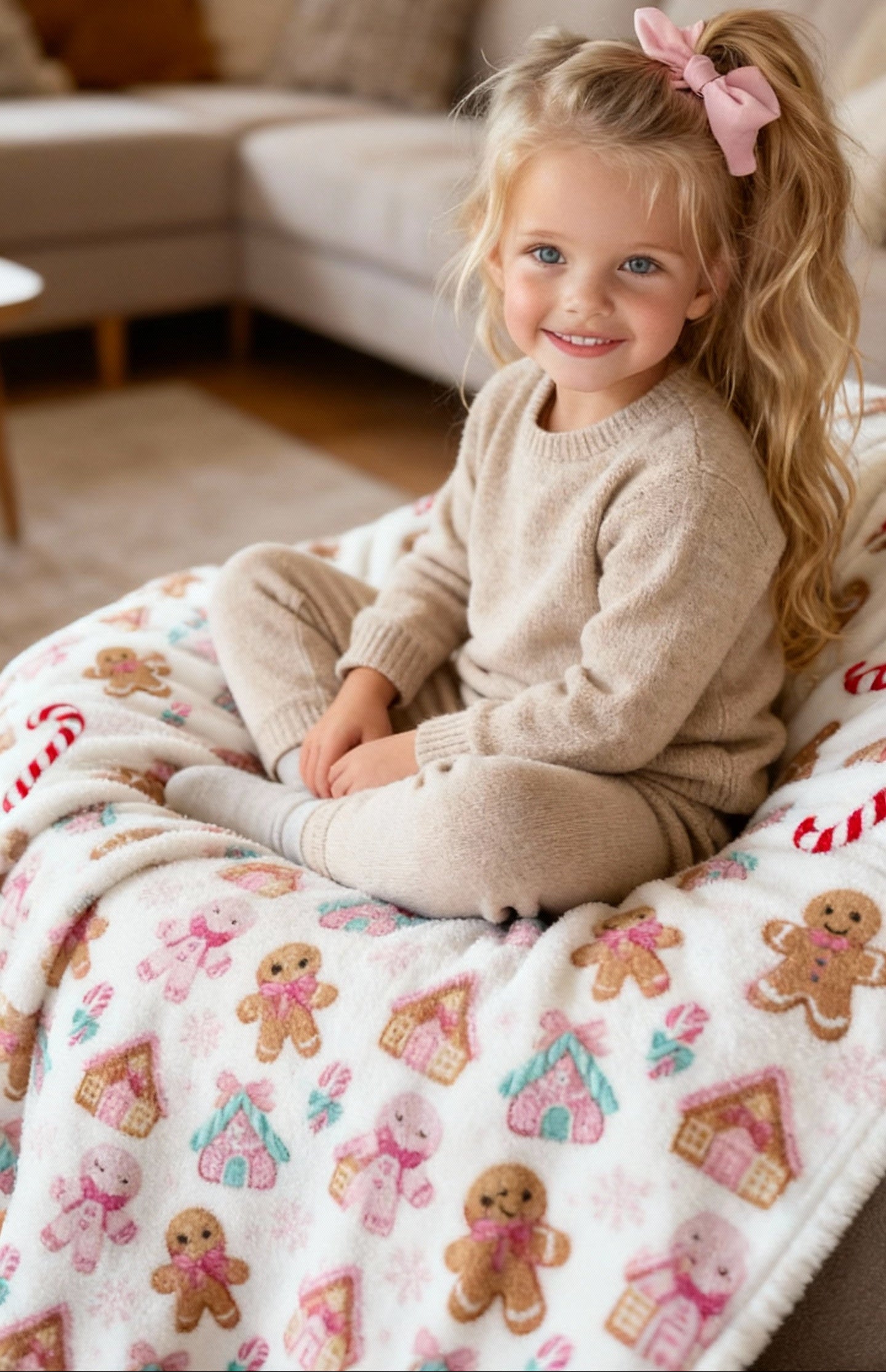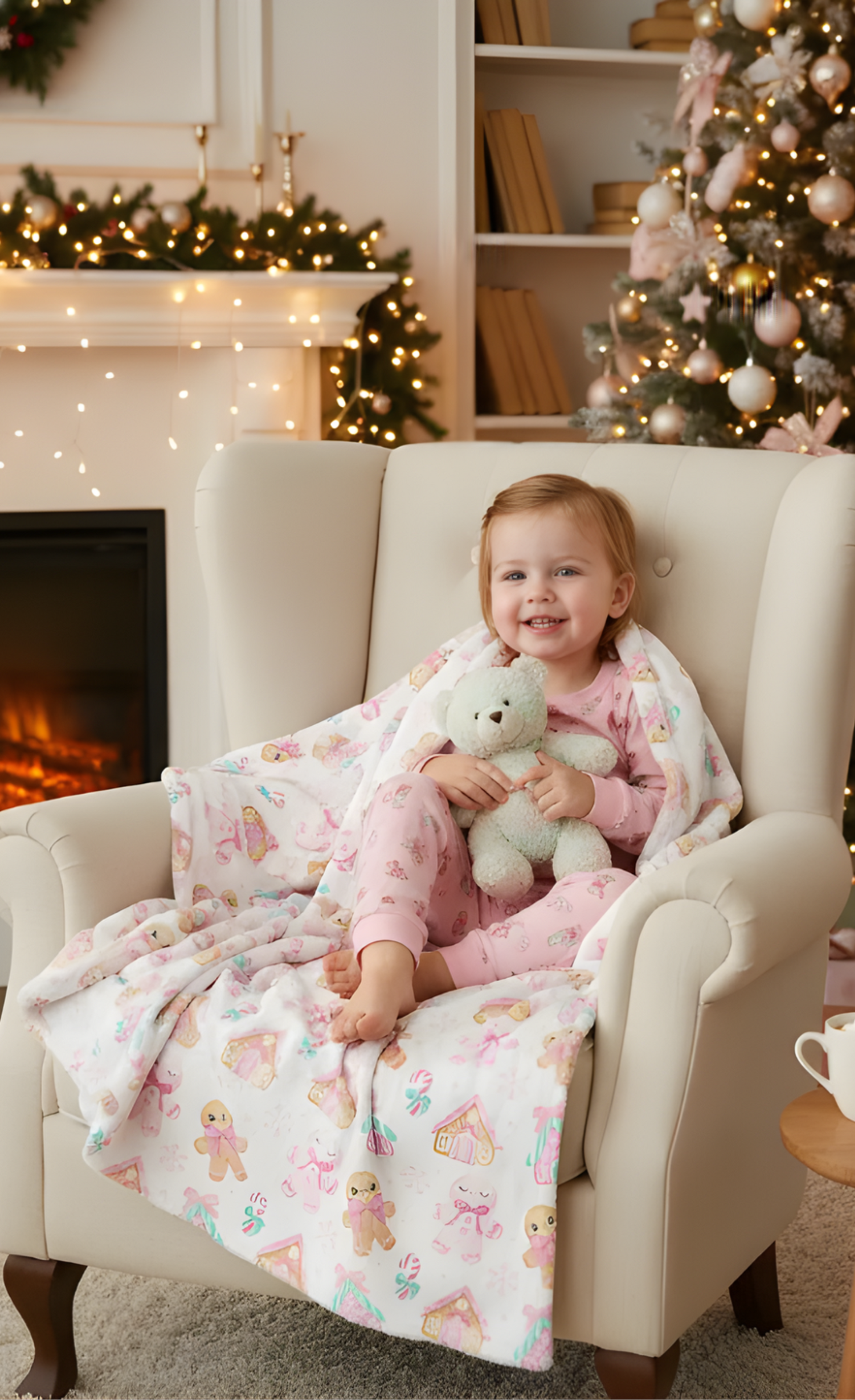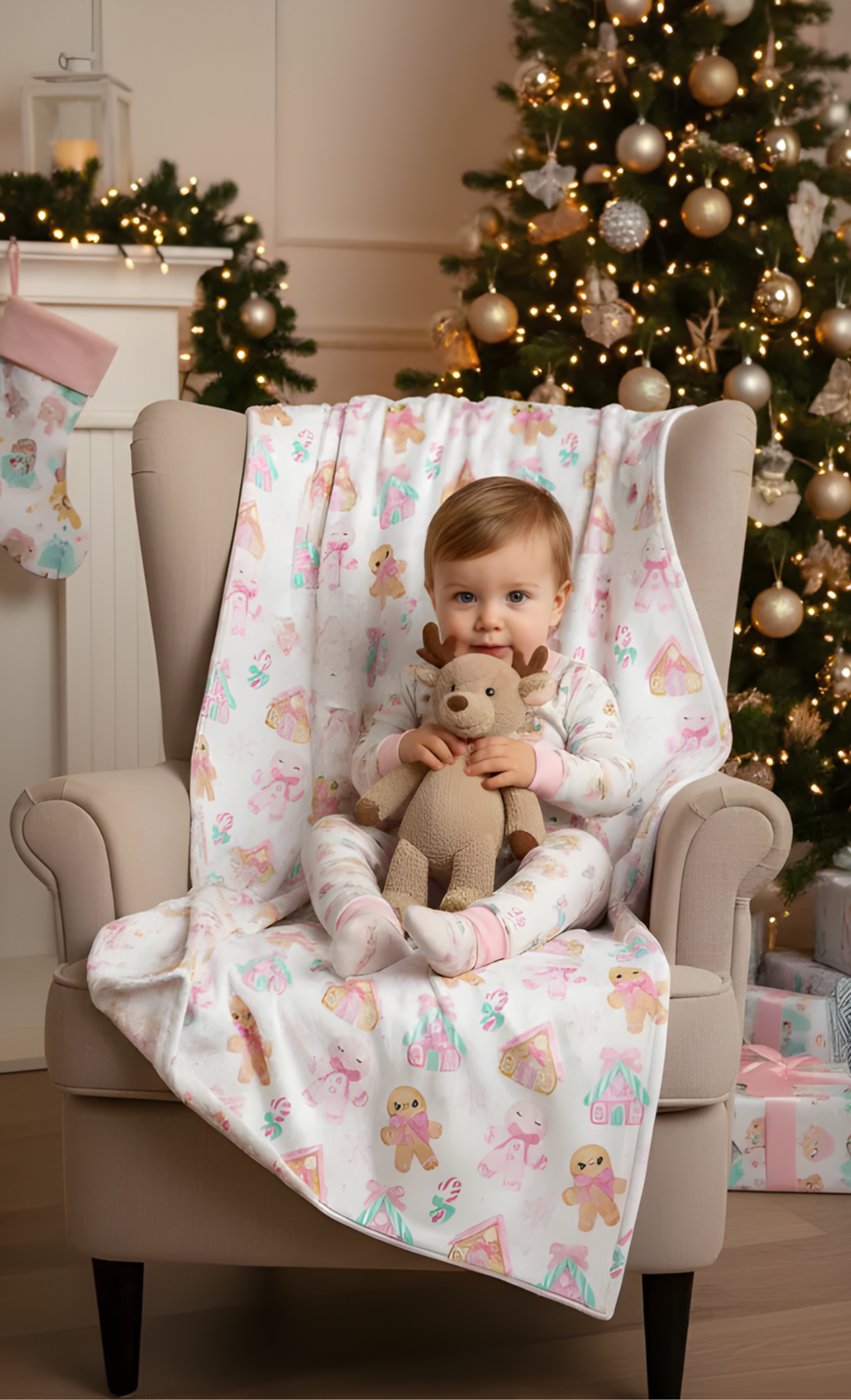 Step into a world of festive charm with the Wonderland Blanket, designed to wrap your little one in warmth and whimsy. Featuring a delightful pastel pattern of gingerbread houses, candy canes, and holiday treats, this blanket brings a soft, magical touch to your child’s winter moments.